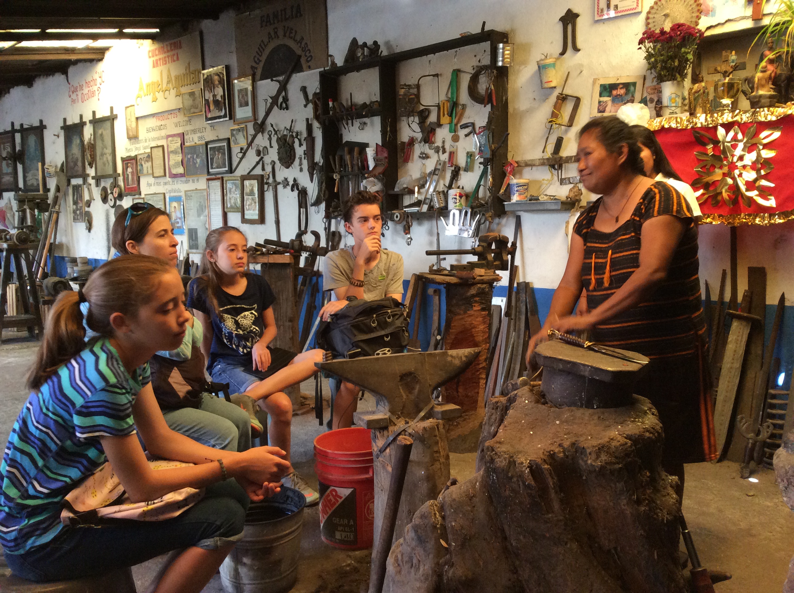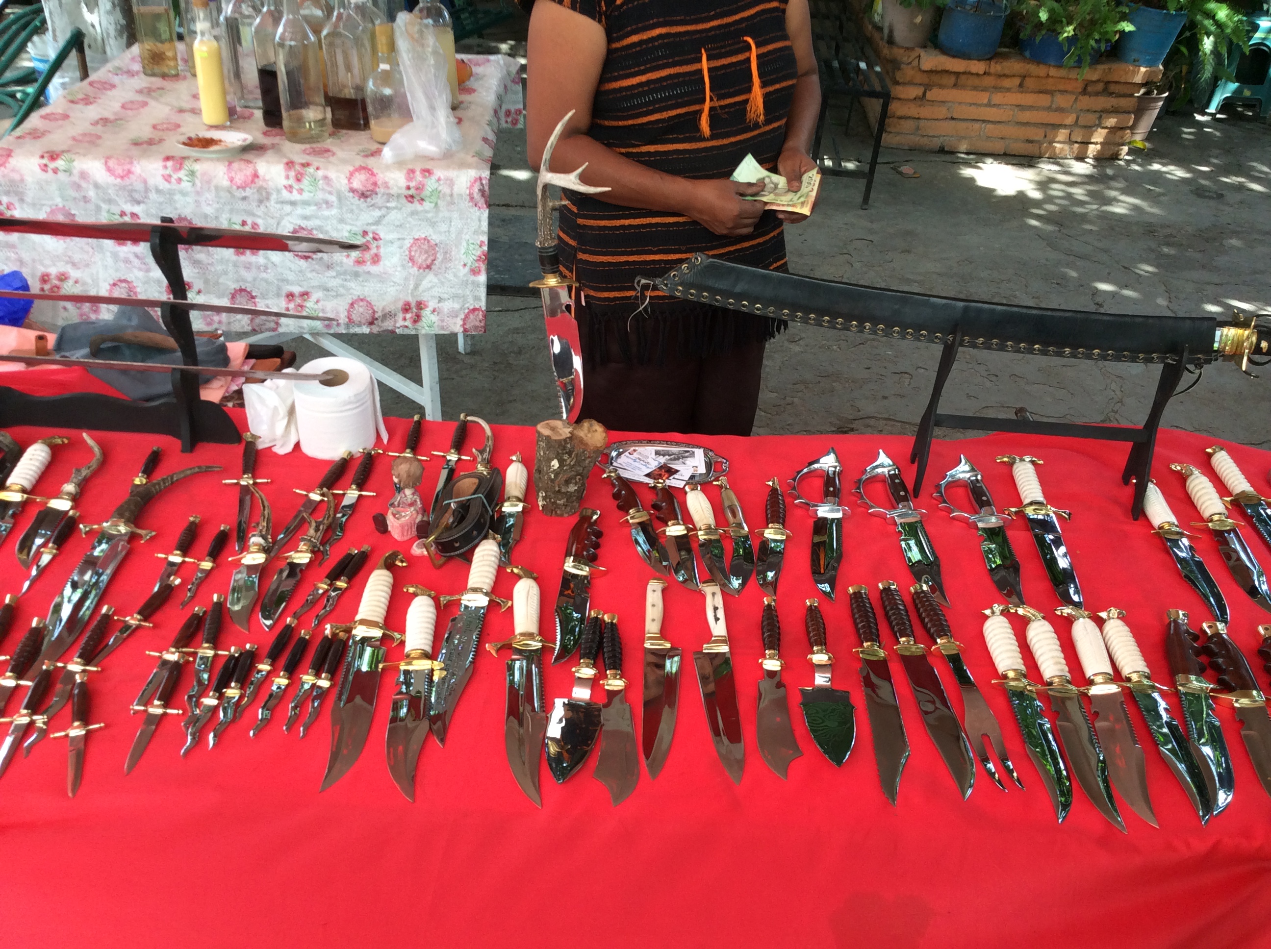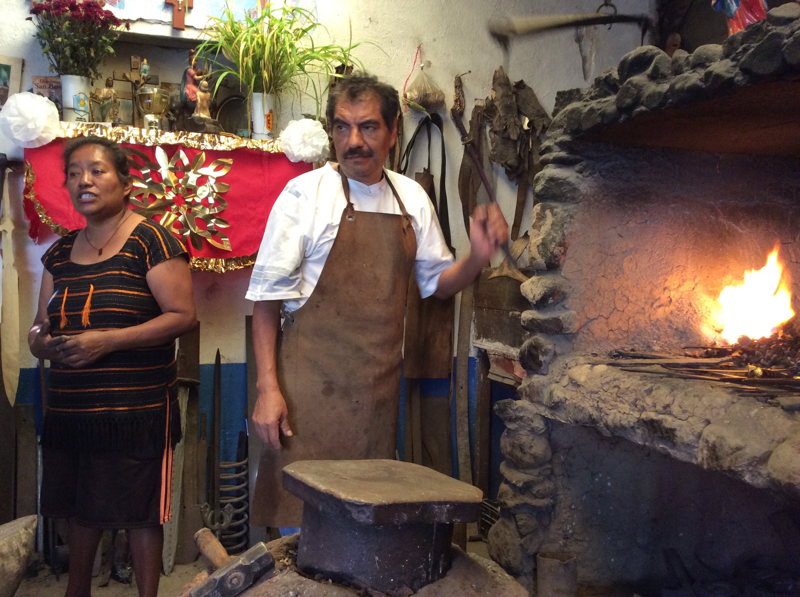 Our first stop was in the small pueblo of Ocotlán de Morelos at the studio of Apolinar Aguilar Velasco, a famous craftsman of handmade swords and knives. We spent a good hour at his studio as he taught us the 100 year old process he uses. What I found amazing was that they use all recycled materials from melted down keys to car pistons. His swords have been featured in many movies like Conan the Barbarian, and he now exports knives and swords to the U.S. He even has a seasonal workshop in Wimberly, Texas where he makes knives for festivals and the movie industry.