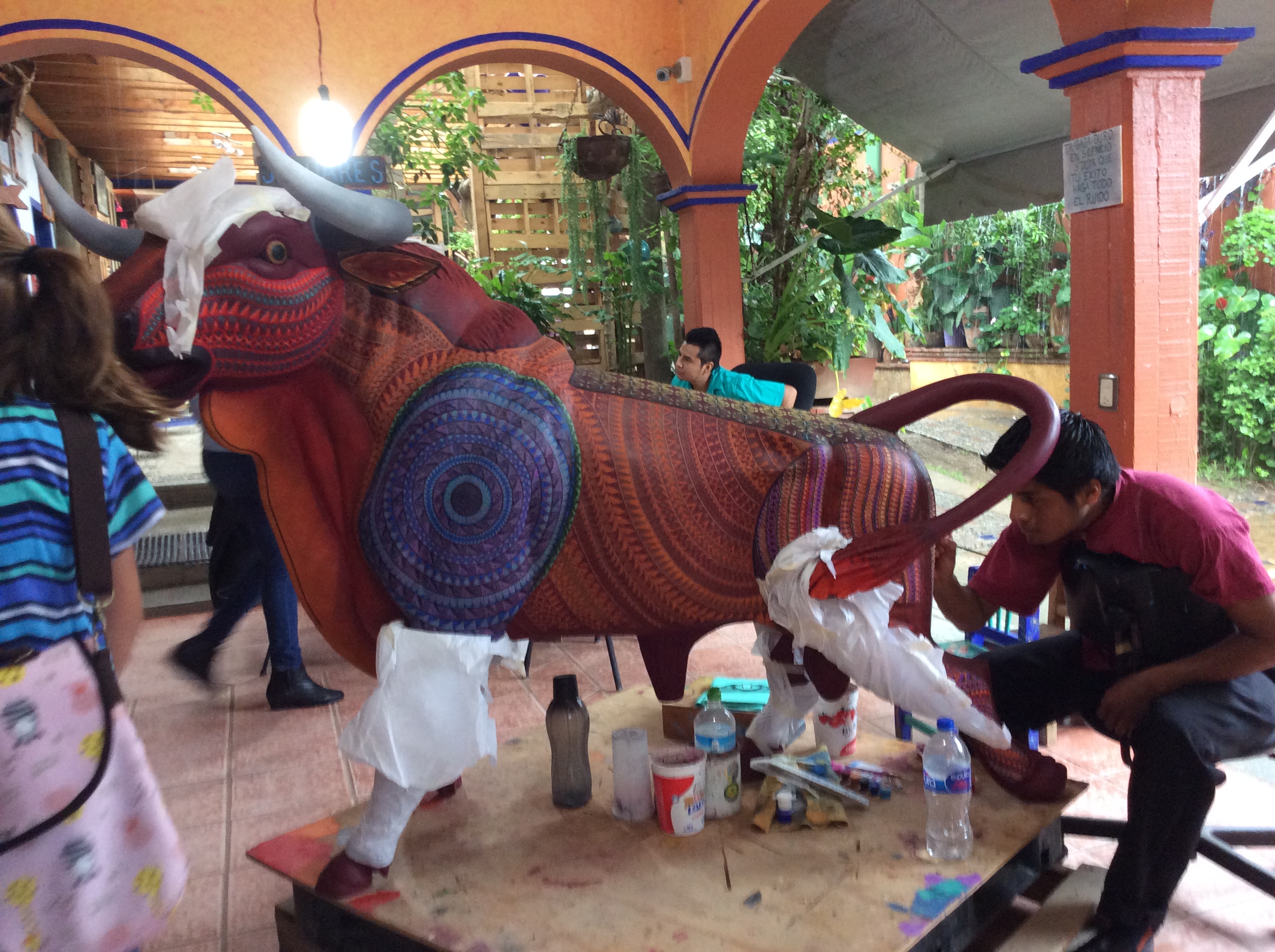 Next, we got back into the van and drove to the town of San Martín Tilcajete, famous for Alebrijes, fantastical animals carved out of wood and then painted with bright patterns. We visited the studio of Jacobo y Maria Angeles. The craftsmanship was crazy and it made both Marty and I green with envy.