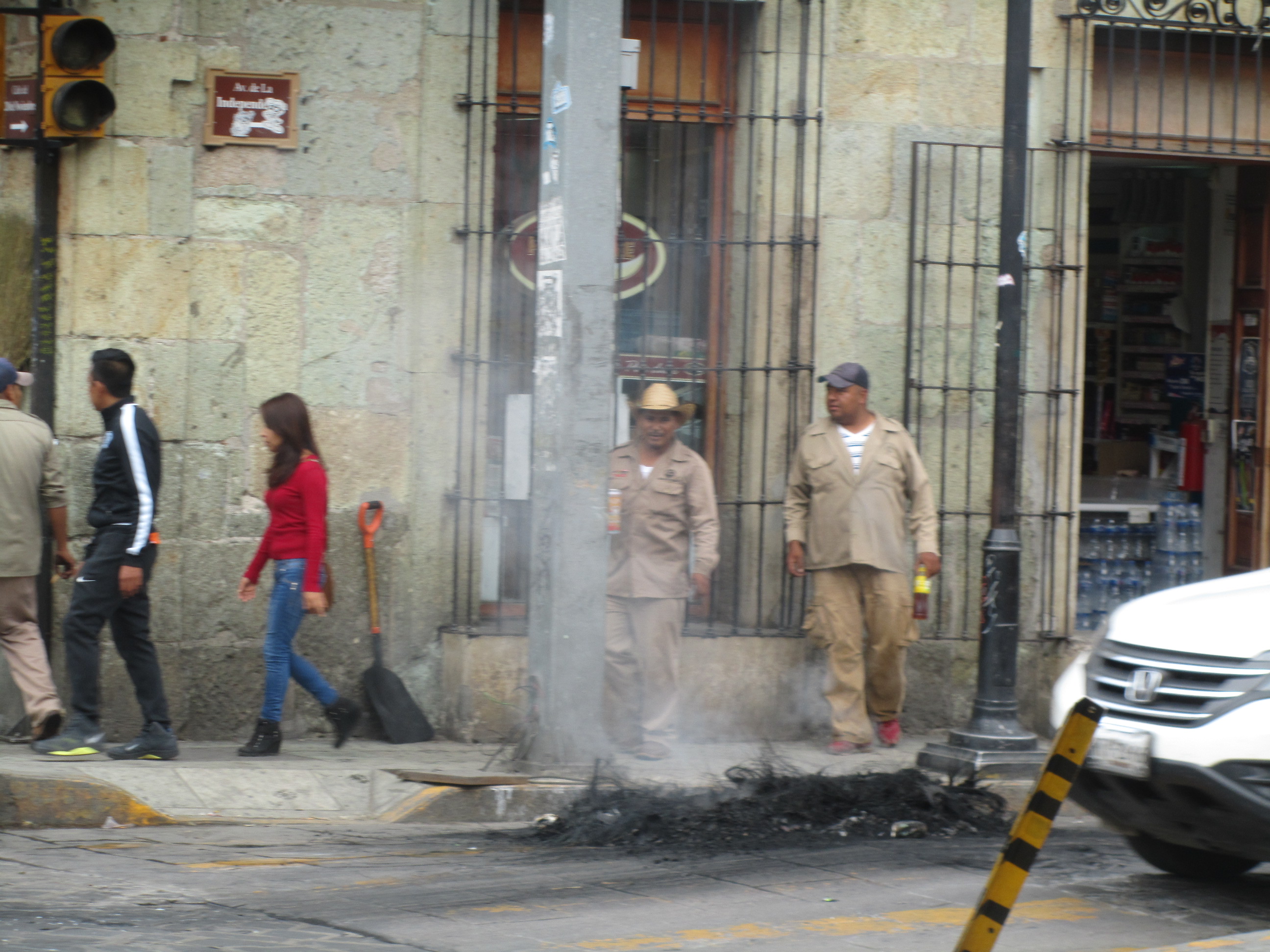 After breakfast we headed towards the Zócalo to find a representative from the San Tours Company to take us out of town. We had been handed a flyer a few days before and knew where we wanted to go. The Zócalo is a park in the center of town, and is generally a lovely open-air, tree-lined space where people can sit or walk around. Since May 15th, however, the Zócalo has been filled with protesting teachers on strike who have taken over the space and set up a tent city where they are protesting the educational reforms the government is trying to impose upon them. Apparently, the government is trying to mandate a fee for tuition and books for the families who send their children to public schools, and in the poorest states like Oaxaca, this means many children will be unable to afford a basic education. Some families have the means to send their children to private schools, so these reforms do not affect them. Most of the people I have talked to see it as just one more way the rich stay rich and the poor stay poor. Children here in public school don’t get out for vacation until July, but since the teachers have been on strike, they have already been out for a month. The problem is that not only are the students not getting an education, but the businesses in and around the Zócalo are basically shut down due to the numbers of protesters who have occupied their space. This is completely legal in Mexico and happens regularly. This morning as we were walking around it, the air was filled with smoke as enormous piles of tires and trash had been burned during the night in the middle of the streets. Apparently, it was another act of protest and the police and teachers had clashed over it the night before. We were told it didn’t end well.
