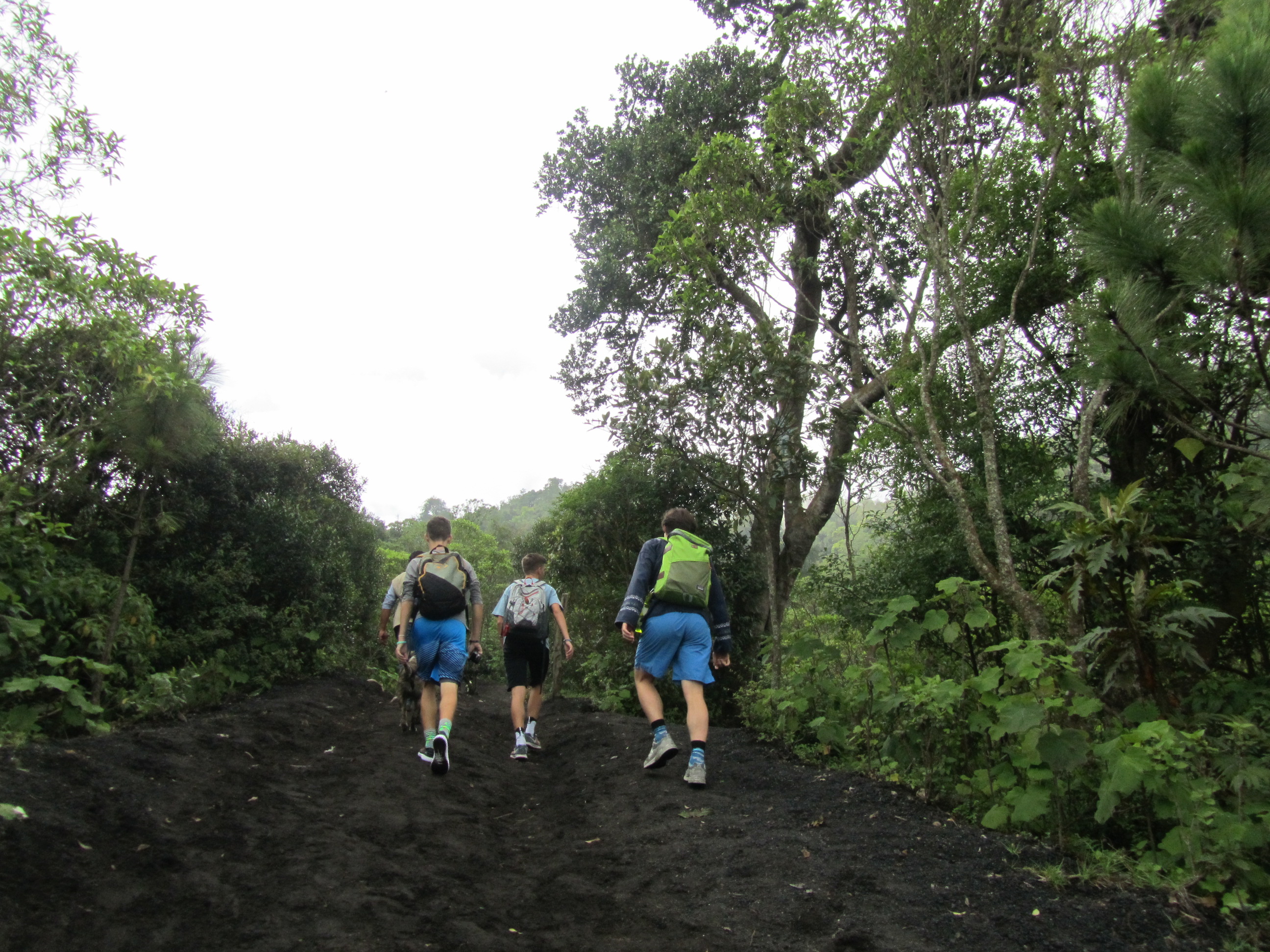 When we finally reached the parking lot to the park entrance, we were immediately bombarded with children trying to sell us sticks. I had already decided to heed the advice I read on-line and snatched up four for 5 quetzales each (about 75 cents). I think the other passengers in the van thought I was a sucker. I bet it wasn’t five minutes into our climb before they changed their minds. Honestly, it turned out to be the best 75 cents I have ever spent. For the next 2 hours we climbed and climbed and climbed. The trail was black volcanic rock and ash, with a considerable amount of horse dung mixed in. (People who don’t think they can handle the climb rent a horse.) Imagine trying to concentrate on walking straight up AND dodging fresh horse poop every 15 to 20 feet. Not an easy task, I assure you. Then of course, there were the dogs that accompanied us. I counted at least 10, and they make the trek with the guides several times a day.