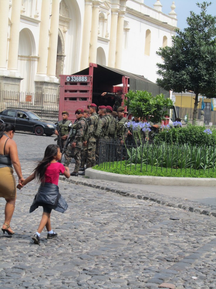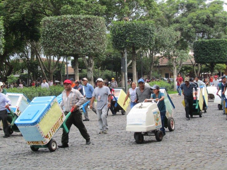 After class lets out, we have been heading to lunch and then walking around town. Yesterday was quite entertaining. We made our way to the Parque Central where and were greeted by many official looking men standing on the street corners with machine guns. Now, while this is totally normal in many countries, we had yet to see it in Guatemala. Turns out, the Presidents of Guatemala and Mexico were about to arrive in Antigua, and we were in just the right spot at the right time. We all sat down on the steps lining the street to wait for the big arrival, when all of a sudden we heard yelling and horns blaring down the street. At first it looked like a huge procession, but as they approached, it turned out to be about 20 people pushing ice cream carts. They came down the street yelling and screaming and stopped right in front of us. (Little did we know that we were sitting in front of the city municipal offices.) They were protesting a city tax being imposed upon them and asking the alcaldeza (like the mayor) to lift it. I’m not sure if it was a coincidence that they chose the same exact day and time as the president was due to arrive, but it certainly added a bit of drama to the scene. It started to rain and we ended up leaving before the presidents arrived, but it definitely was exciting while it lasted.