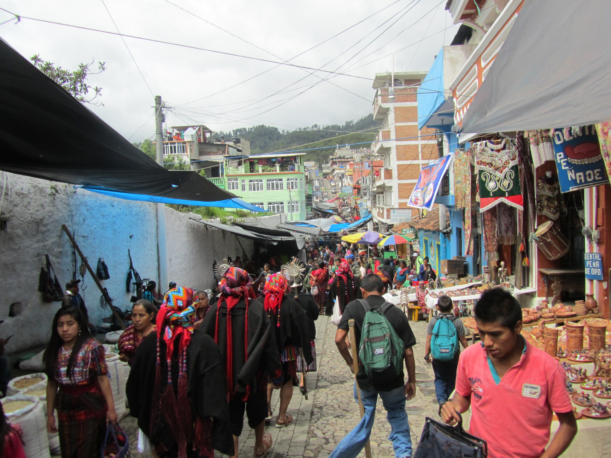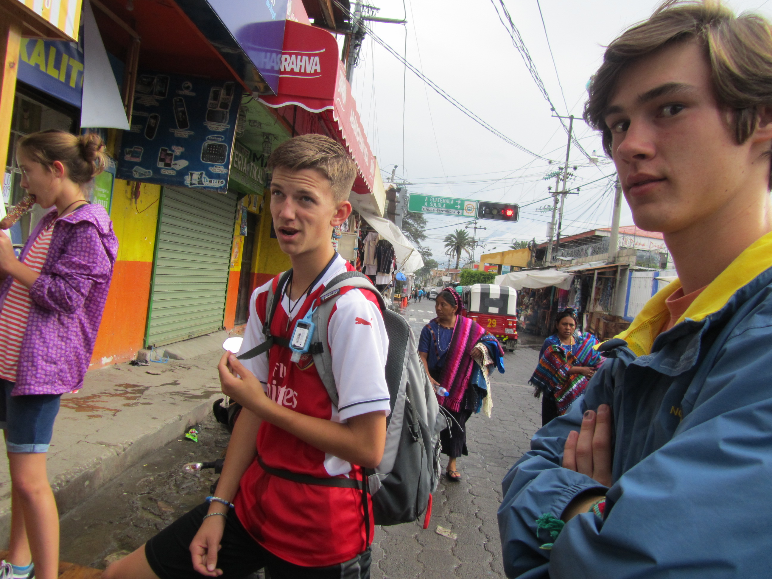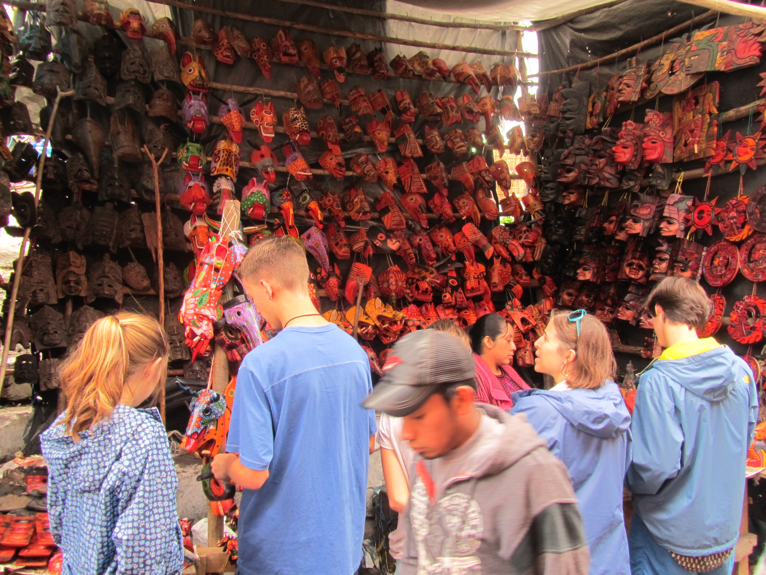Our next stop was Chichicastenango, home to one of the largest markets in Guatemala. After an hour-long van ride, we were dropped off in a random parking garage and told to return four hours later. We were told by a seasoned tourist to leave our belongings in the van, and I am so glad we did. The phrase “Swimming in a sea of humanity” cannot begin to describe the claustrophobic shopping experiences that lie ahead. We literally waded through people, merchandise, and chickens (both dead and alive) for the next four hours. I think I pulled a personal all-time best for haggling by purchasing all of my items for at least half the price I was initially quoted. Loaded down with bags four hours later, we emerged exhausted, a little disillusioned with shopping, and the satisfaction of knowing that we probably won’t have to buy anything ever again. That is… until we pass by the coveted soccer jersey stall. Oh these kids (and one male adult) and their infatuation with soccer gear.