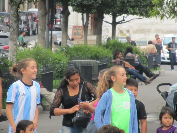 The idea of taking salsa-dancing lessons has been floating in the air for the past week and a half. The school we attend offers free salsa lessons Monday and Tuesday nights from 5 to 6:30 at a local dance studio called New Sensation Dance Company. I would be exaggerating if I said the kids on this trip were less than enthusiastic about the prospect of taking salsa lessons, but Marty and I said they had no choice and it was a done deal. However, we missed classes last week due to the newness of being here, and yesterday we made the mistake of coming home first. We got comfortable and of course the pouring rain did not help us in our attempt to rally. We told the kids that today was the day and they needed to mentally prepare themselves. To make it easier, we spent the afternoon in a local coffee shop on the Parque Central so we couldn’t talk ourselves out of going again. We lazily drank coffee and gazed upon the peaceful madness that is the center of town. The girls even made themselves at home by playing with local kids trying to catch bubbles.