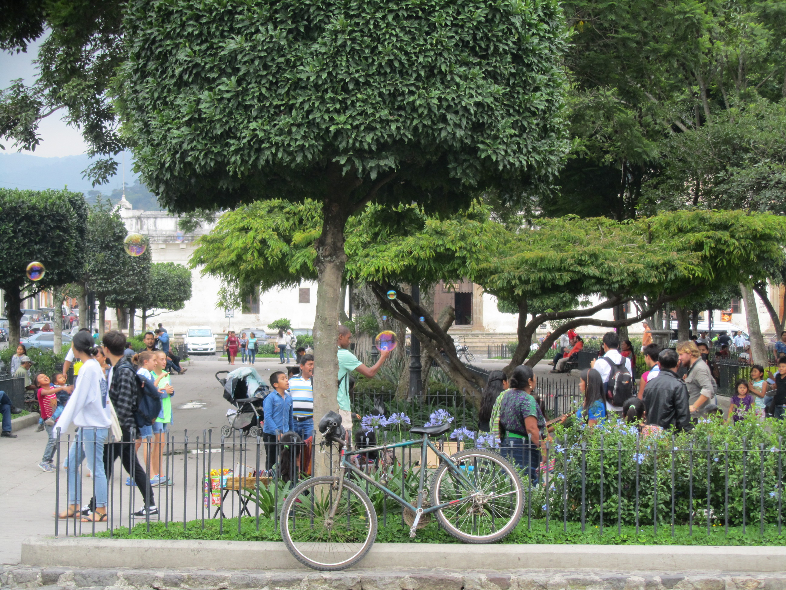 The idea of taking salsa-dancing lessons has been floating in the air for the past week and a half. The school we attend offers free salsa lessons Monday and Tuesday nights from 5 to 6:30 at a local dance studio called New Sensation Dance Company. I would be exaggerating if I said the kids on this trip were less than enthusiastic about the prospect of taking salsa lessons, but Marty and I said they had no choice and it was a done deal. However, we missed classes last week due to the newness of being here, and yesterday we made the mistake of coming home first. We got comfortable and of course the pouring rain did not help us in our attempt to rally. We told the kids that today was the day and they needed to mentally prepare themselves. To make it easier, we spent the afternoon in a local coffee shop on the Parque Central so we couldn’t talk ourselves out of going again. We lazily drank coffee and gazed upon the peaceful madness that is the center of town. The girls even made themselves at home by playing with local kids trying to catch bubbles.