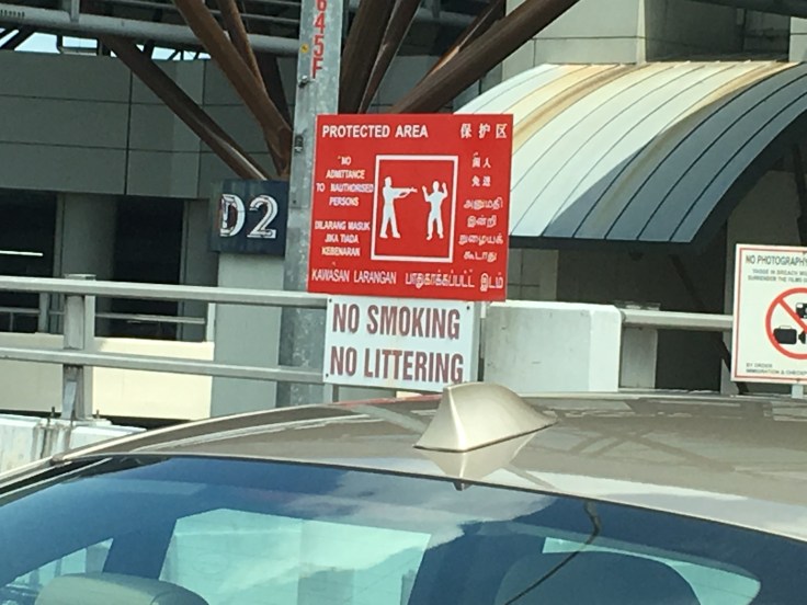 Last Friday we took a quick trip into Singapore. (Lovingly called the Singapore Swing.) We were initially told not to go into Singapore because we didn’t want to delay the work visa process. We were then told that we had to take a day trip to Singapore to get an exit and entry stamp for our work visas. I learned long ago in Taiwan that after you ask for clarification the third time, it is best to just get in the car and let it go. The border is literally ten minutes from our house and it is super bizarre. I have heard that depending on the time of day, day of week, etc… it can take anywhere from 5 minutes to 3 hours to cross. The line of cars leading up to a border patrol agent split into about 10 different lines, zigzagging every which way so that quick entry or exit is impossible. Apart from the intimidating signs, it was all quite civil… although I think a few of our new co-workers from South Africa who came with us were genuinely freaked out. Once we got through customs (took roughly 15 minutes) we entered Singapore. All we did was get dropped off at a nearby mall for an hour and a half, and then we were headed back. The mall was fancy, as far as malls go, but we got there so early that the only thing open was Starbucks. Oh well. The mall was empty except for an amazingly long line of elderly people outside of a technology store. Turns out Huawei was running a special for people over 50… 50% off of their newest phone. It was totally like Black Friday at Walmart. When we finally left Starbucks an hour later, the mall was packed and the shopping mania had begun. The trip back took about an hour due to long lines heading across to Malaysia. We will certainly go back once we have our work visas in order (not to the mall!) , but from what I could tell it was all incredibly orderly, there was NO TRASH ANYWHERE, and I sure did see a lot of hidden cameras. CCTV here we come!