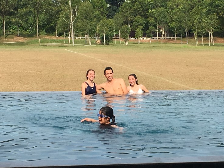 Soccer season starts soon and the girls have already joined an area co-ed club team to prepare. During the first practice we attended, only 12 players showed up. The following week, there were 25 players, all but 3 of them boys… I suppose word got out about some American twin girls with mad ball skills. The great thing about practices is that there is an infinity pool with a full restaurant and bar that overlooks the soccer pitch. This adds an entire new dimension to the role of soccer mom… one that I think I could really get in to. Marty and I plan to watch soccer practice tomorrow in the pool sipping on adult beverages and cheering the girls on. Should be rough.